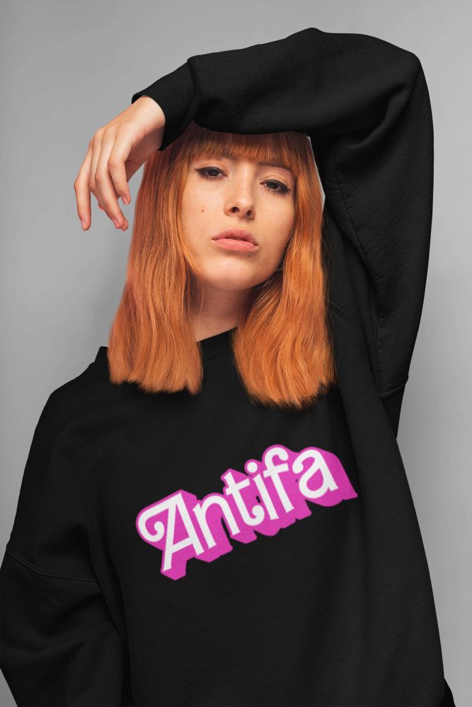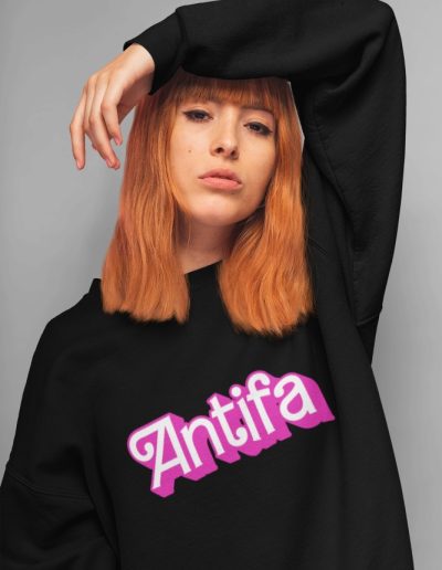Antifa Barbie unisex mikina bez kapuce je kombinací streetwearu, aktivismu a popkulturního nadhledu. Slovo Antifa napsané v ikonickém Barbie fontu dává jasný signál – odpor proti fašismu může být hravý, stylový i nekompromisní zároveň. Unisex střih a kvalitní materiál zajišťují pohodlí a dlouhou životnost, takže tahle mikina je ideální jak na demonstrace a koncerty, tak na každodenní nošení.