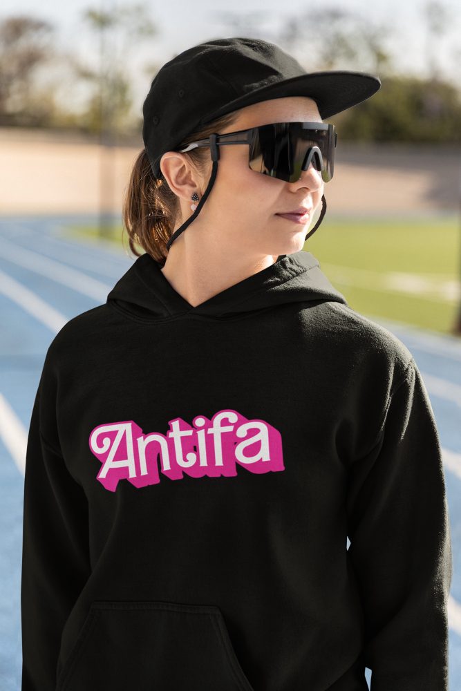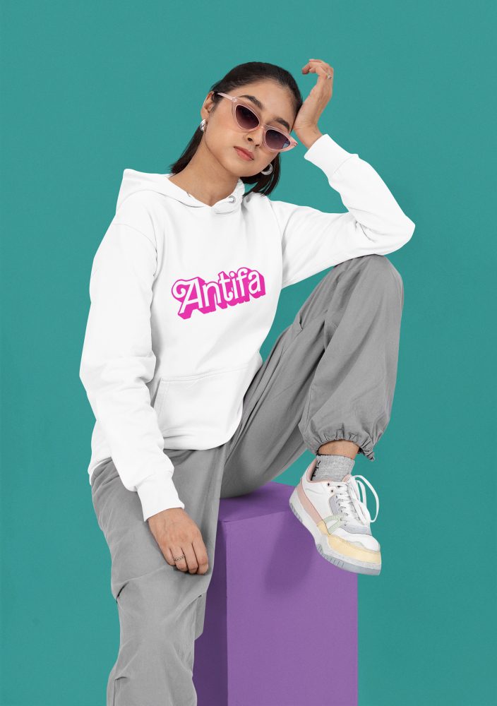 Antifa Barbie unisex mikina s kapucí kombinuje streetwear, aktivismus a popkulturní humor v jednom. Slovo Antifa napsané v ikonickém Barbie fontu dává jasně najevo, že odpor proti fašismu může být stylový, hravý a přitom naprosto vážný. Díky unisex střihu, kapuci se stahovacími šňůrkami a klokaní kapse je tahle mikina perfektním spojením pohodlí a politického statementu – ideální na demonstrace, koncerty i běžné každodenní nošení.
