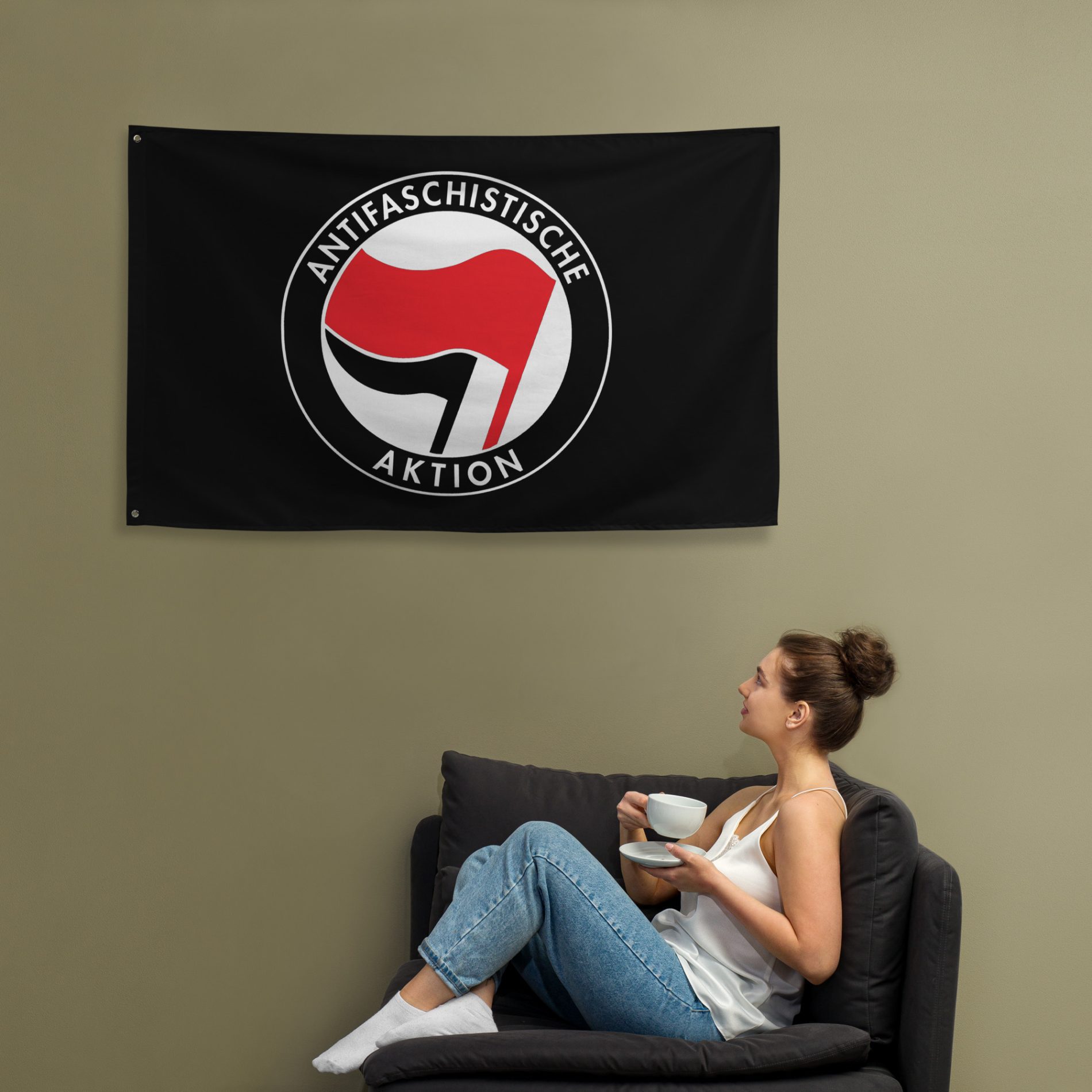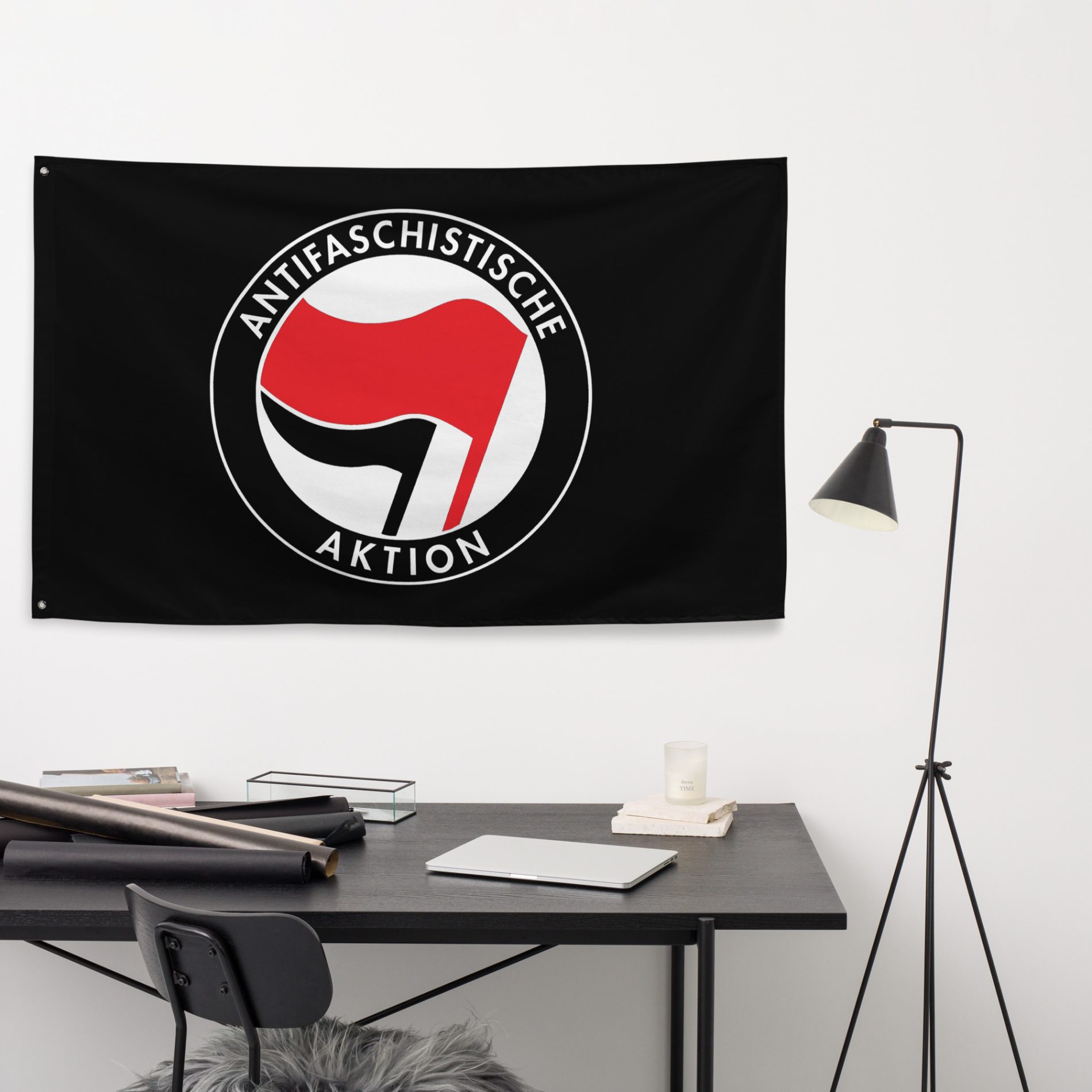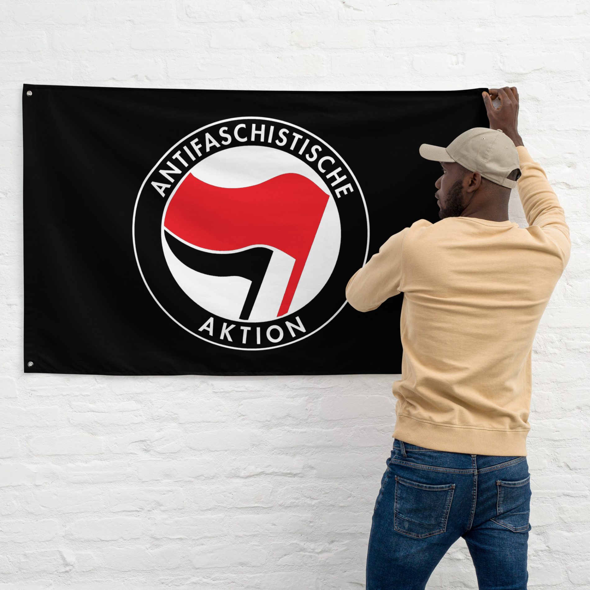 Antifaschistische Aktion vlajka nese ikonický symbol dvou vlajek - jeden z nejznámějších antifašistických znaků vůbec. Je to jasný vizuální statement odporu proti fašismu, neonacismu a normalizaci nenávisti. Motiv je okamžitě rozpoznatelný a funguje jako signál solidarity, organizování a toho, že pro fašisty není v našem prostoru místo.