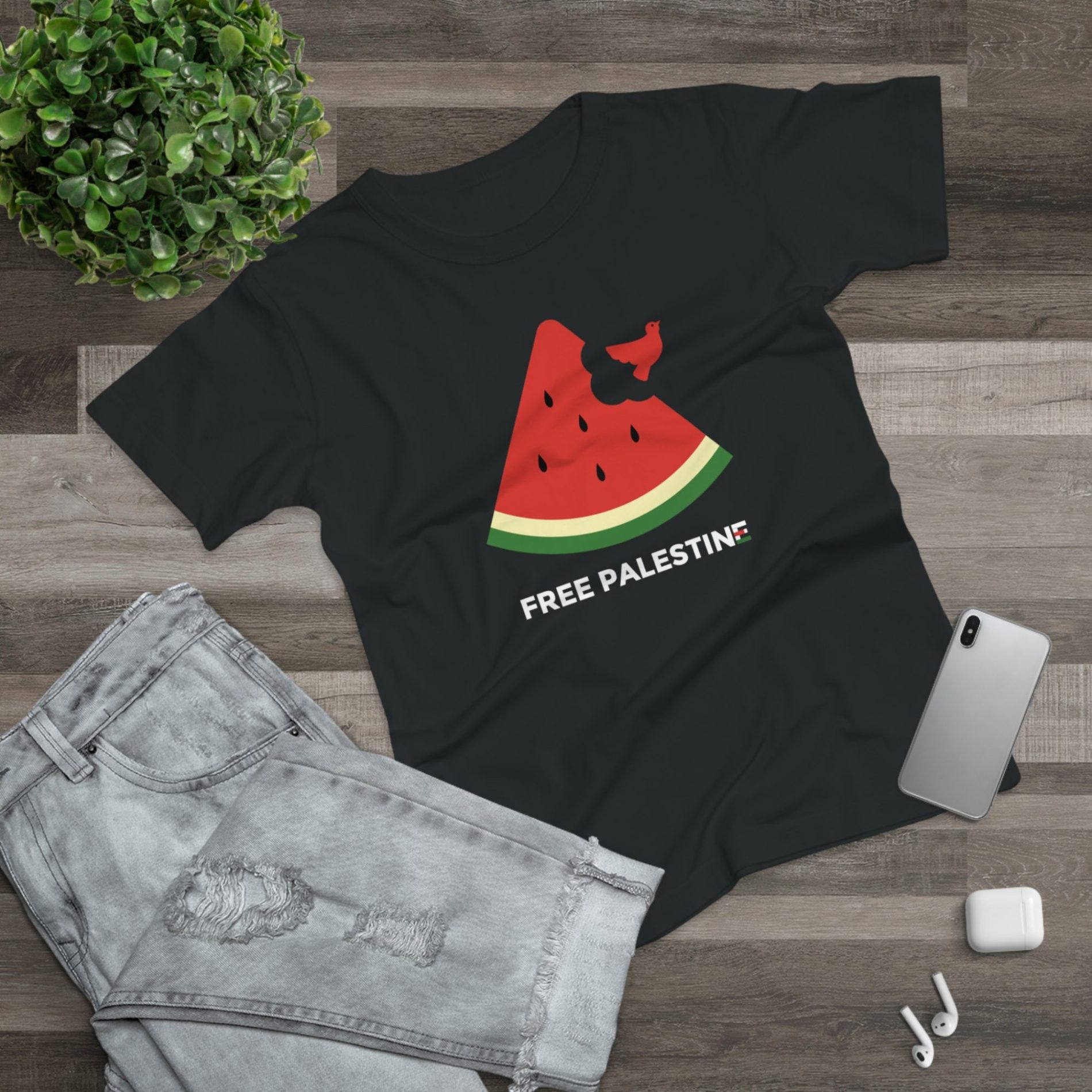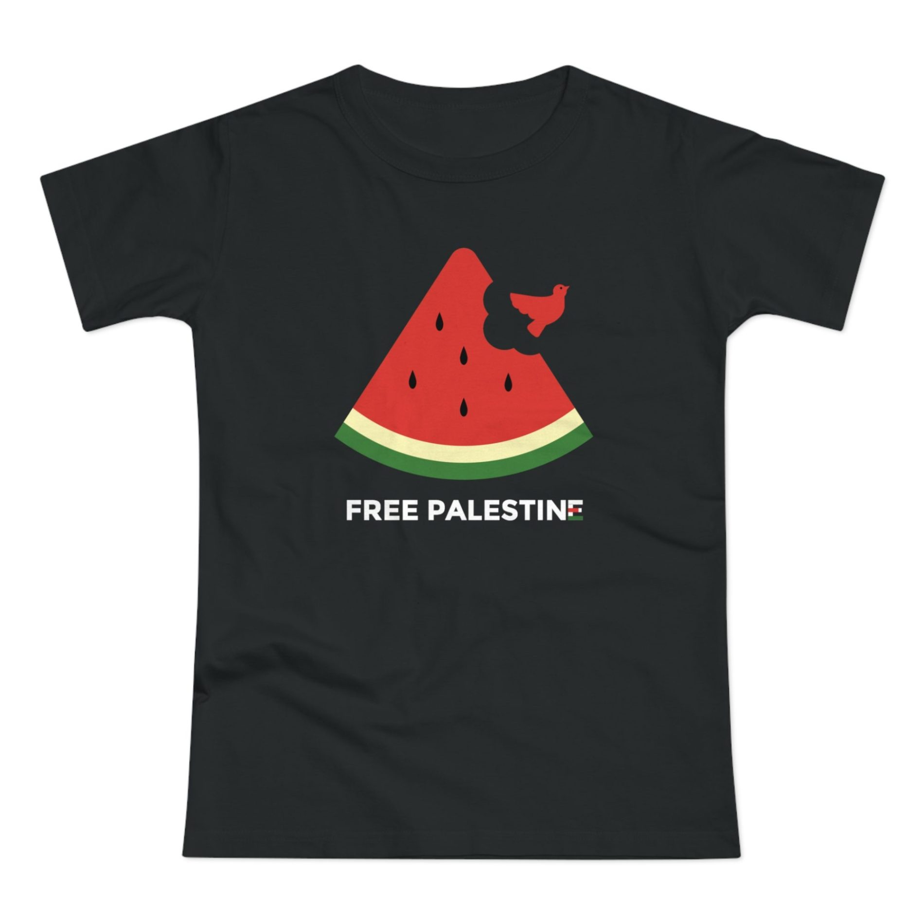 Free Palestine Watermelon dámské tričko nese symbol odporu, který se stal neodmyslitelnou součástí palestinského boje za svobodu. Meloun – díky své červené, zelené, bílé a černé barvě – nahrazuje zakázané palestinské vlajky a stává se tichým, ale silným projevem solidarity.
