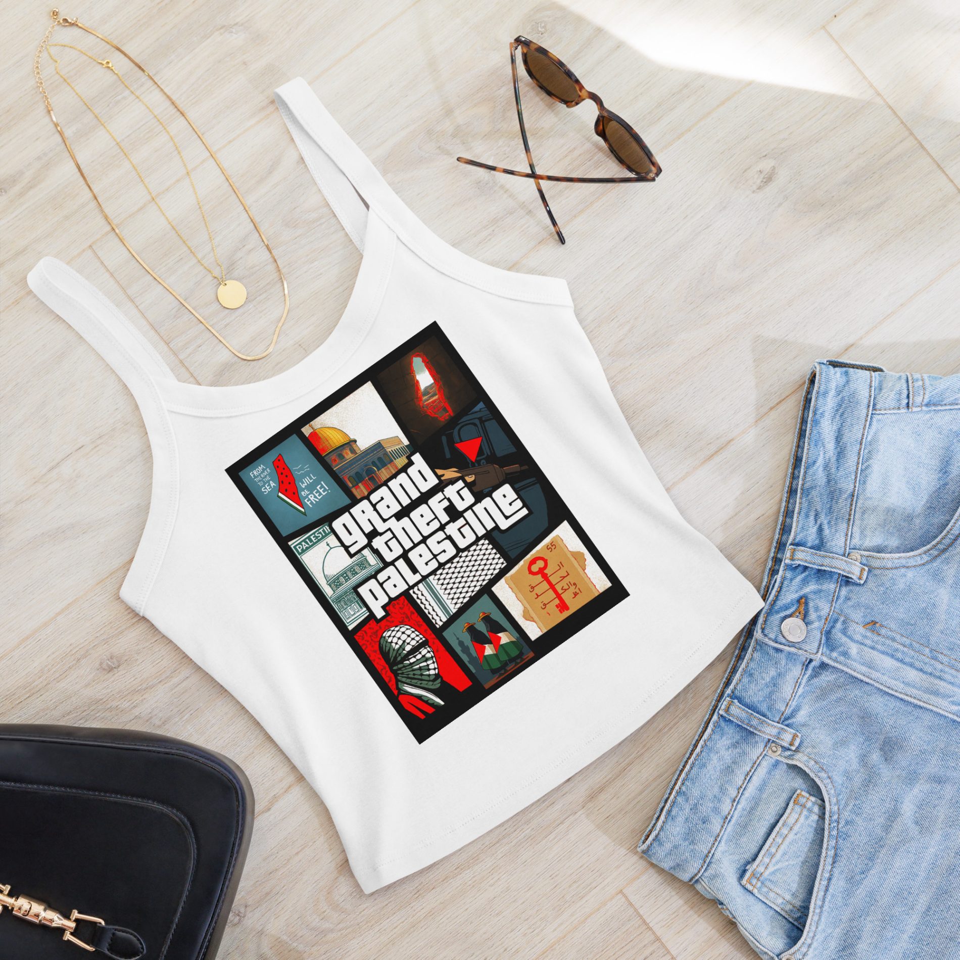Grand Theft Palestine dámské žebrované tílko je ostrý politický statement a popkulturní parodie, která míří přímo na kolonialismus, okupaci a krádež domovů. Tenhle motiv používá známou herní estetiku jako kontrast – aby bylo jasné, že nejde o “debatní téma”, ale o realitu lidí, kterým je brána zem, bezpečí a budoucnost. Je to pro-palestinské oblečení s jasným vzkazem solidarity. Motiv tiskneme kvalitním DTF potiskem, takže zůstává ostrý, sytý a dobře čitelný i při pravidelném nošení. Žebrovaný micro-rib materiál.