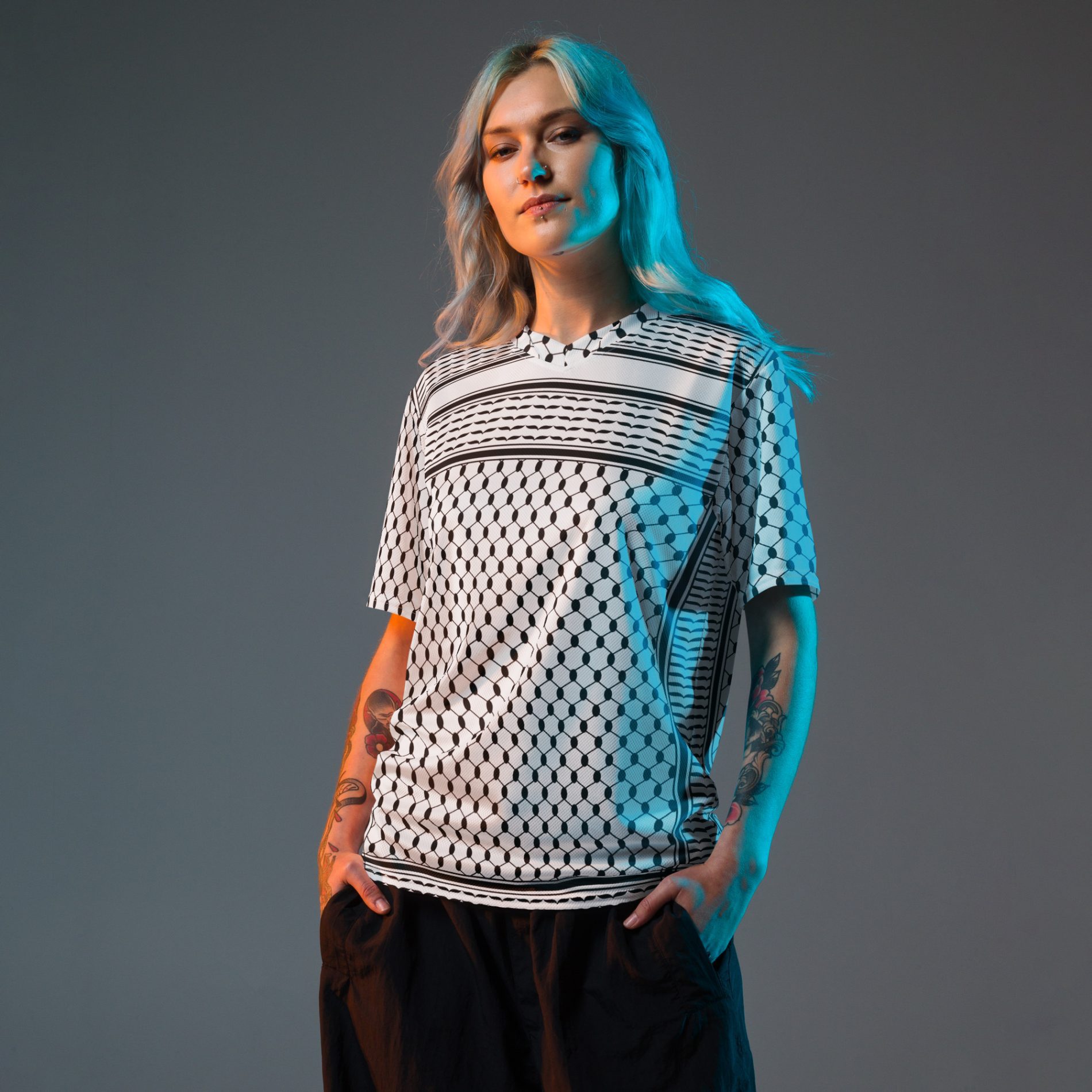 Recyklované unisex tričko s designem Kufiya (Keffiyeh) je víc než jen oděv – je to vědomé vyjádření solidarity. Každý kus je potištěn, nastřižen a ručně sešit.