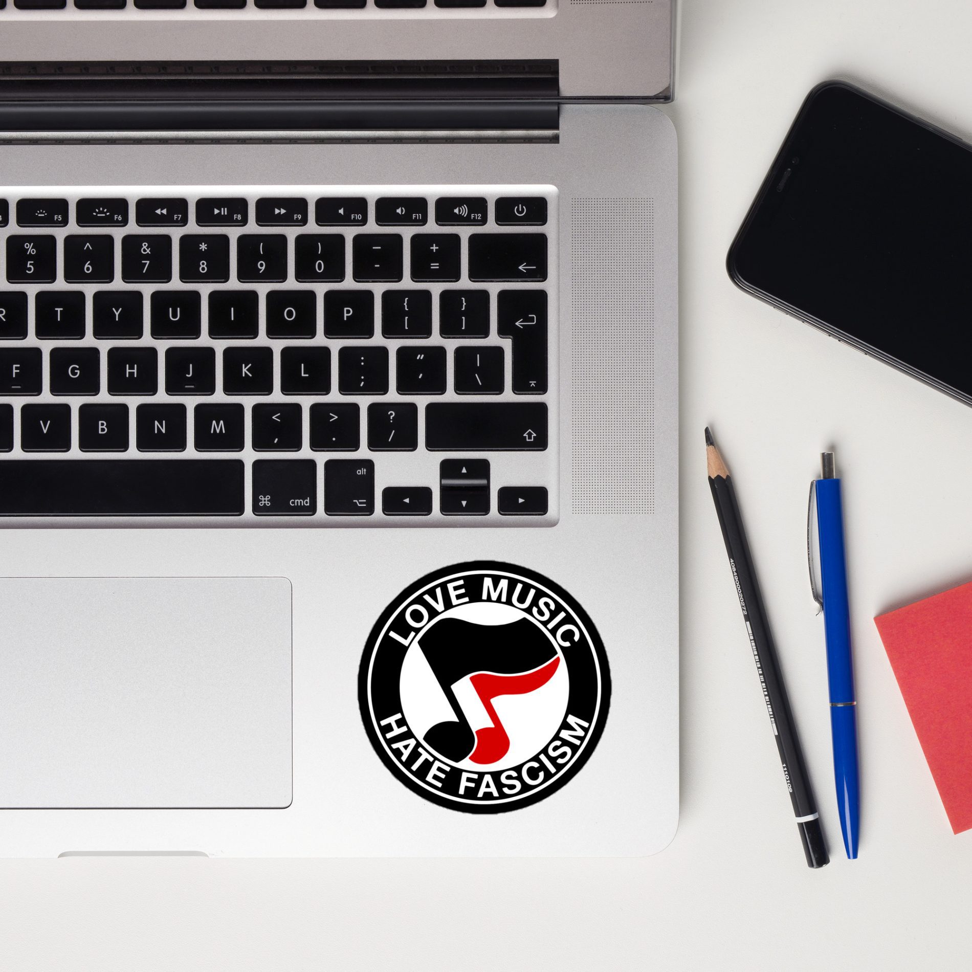 5 recenzí Love Music Hate Fascism kiss cut samolepky