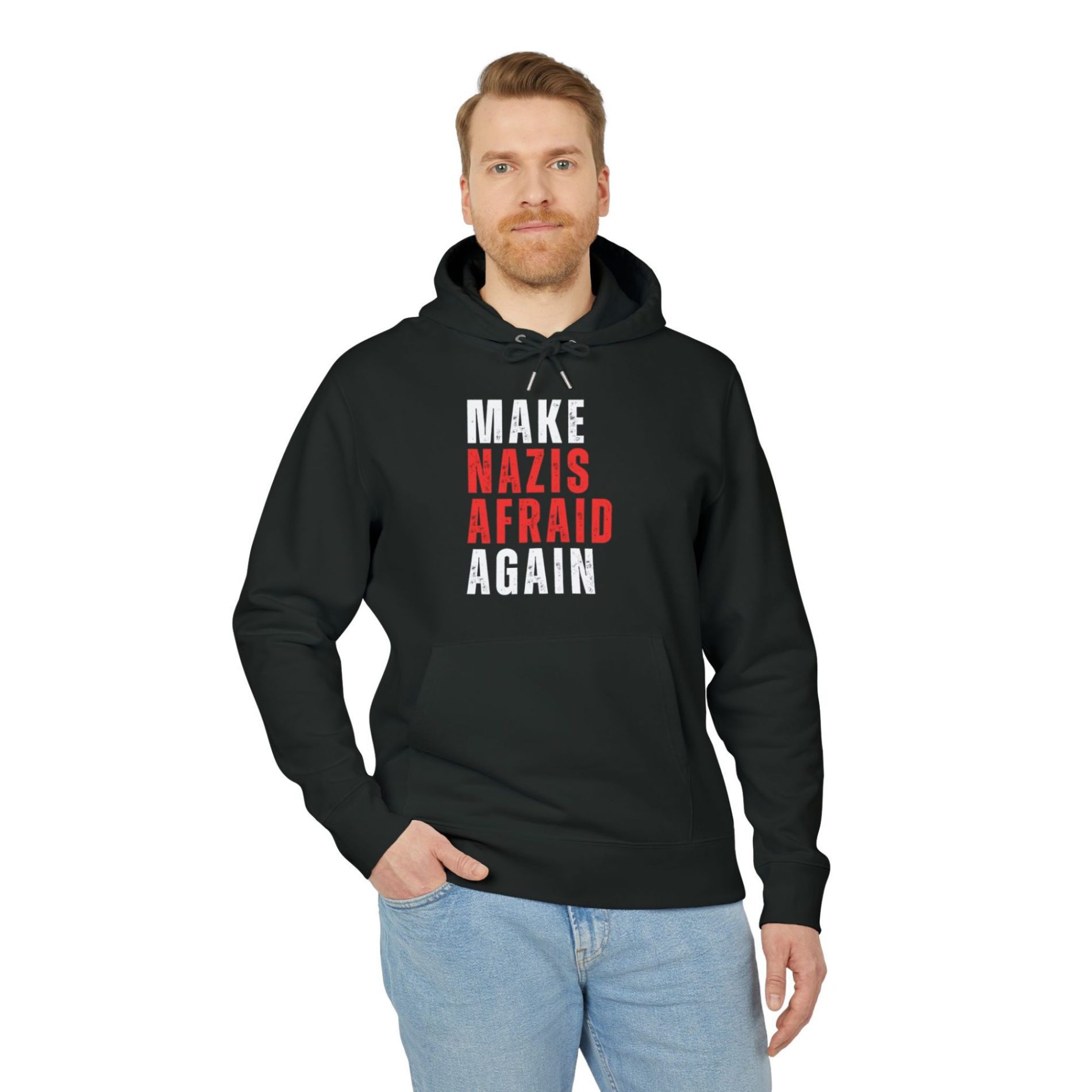 Make Nazis Afraid Again organická mikina s kapucí je přímý antifašistický statement proti neonacismu a fašismu. Tenhle slogan odmítá normalizaci nenávisti a říká jasně, že pro nacisty nemá být ve veřejném prostoru bezpečí ani klid. Je to mikina s potiskem pro lidi, kteří stojí na straně solidarity, sebeobrany komunit a aktivního odporu proti rasismu a autoritářství.