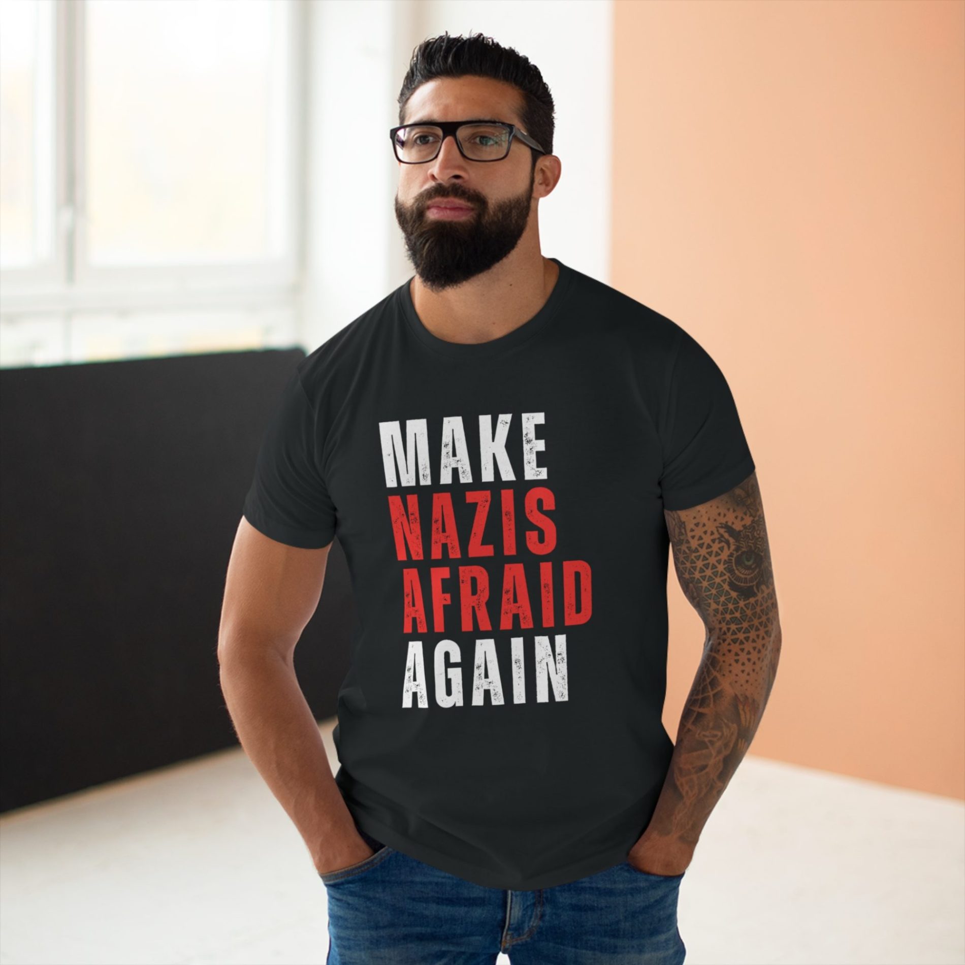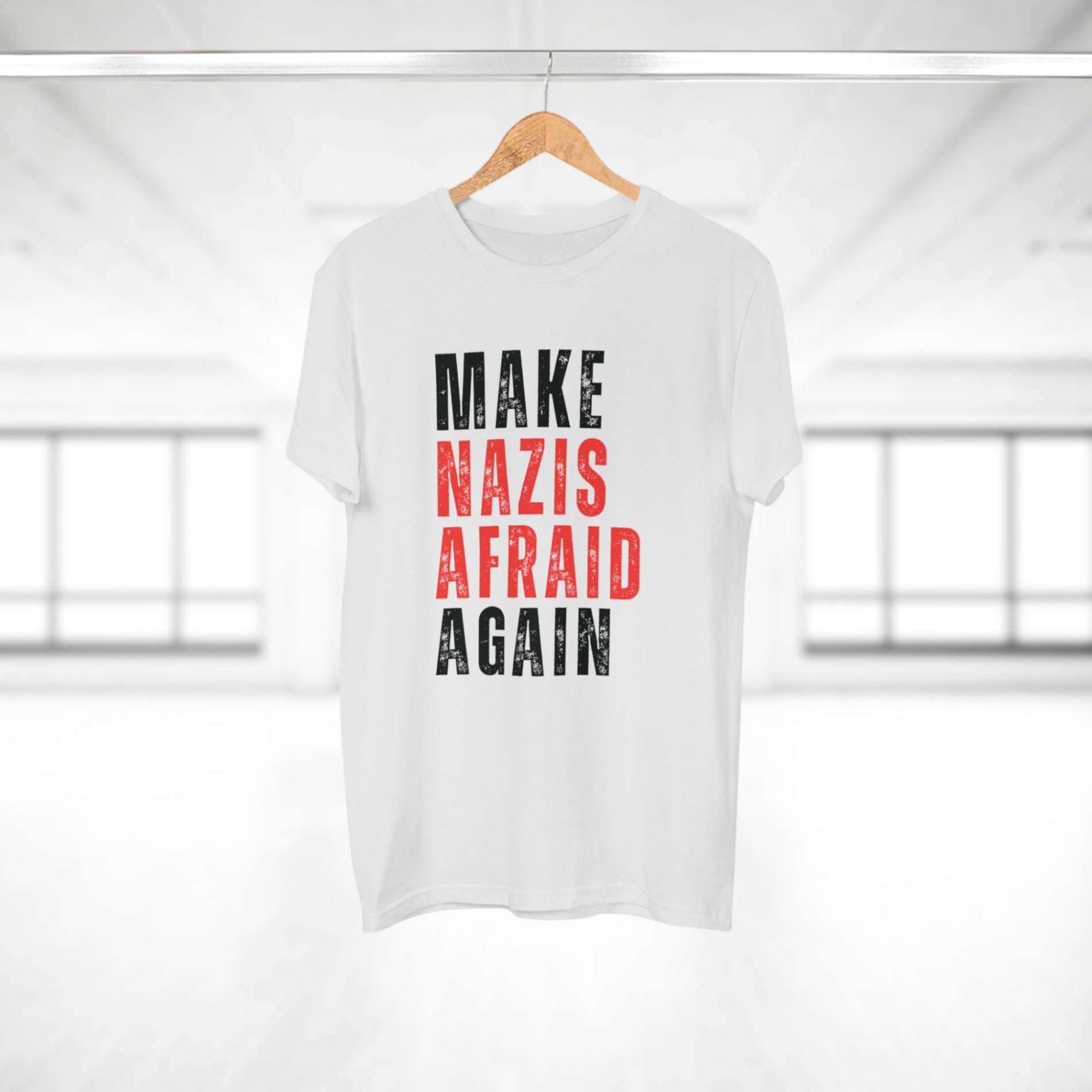 Make Nazis Afraid Again pánské tričko je přímý antifašistický vzkaz proti neonacismu a fašismu. Tenhle slogan odmítá normalizaci nenávisti a dává jasně najevo, že pro nacisty nemá být v ulicích ani ve společnosti bezpečný prostor. Je to tričko s potiskem pro lidi, kteří stojí na straně solidarity, sebeobrany komunit a aktivního odporu proti rasismu a autoritářství.