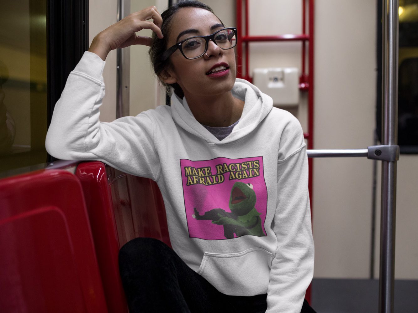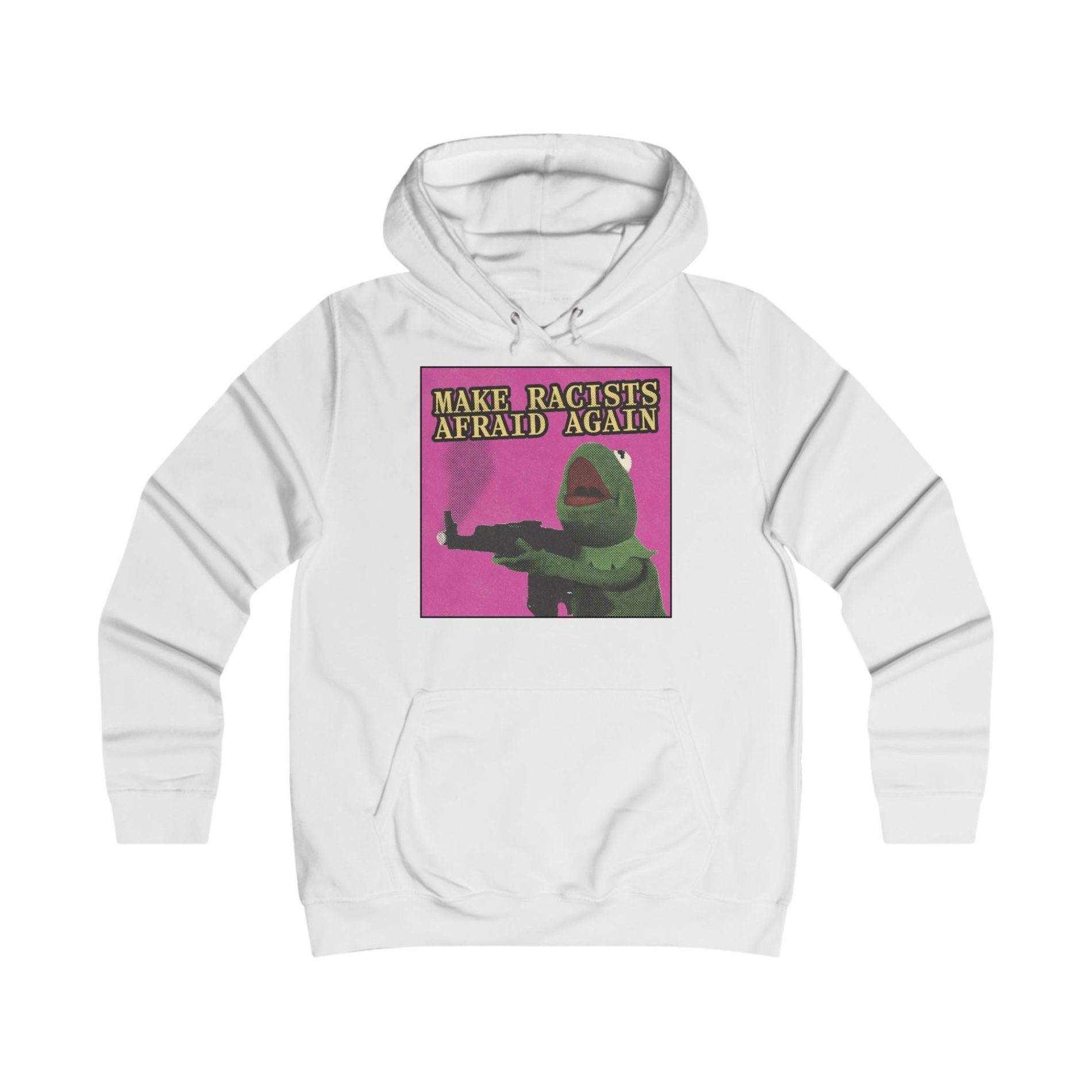 Make Racists Afraid Again dámská mikina je jasný vzkaz všem rasistům: už žádný klid, žádný komfort, žádné tiché přihlížení. Kultovní slogan Make Racists Afraid Again vrací do hry to podstatné – že antirasismus je aktivní postoj, ne hezké přání. Tenhle kousek je ideální pro demonstrace, koncerty, kolektivní akce i běžné dny, kdy chceš, aby tvoje oblečení mluvilo za tebe. Dámský střih přirozeně sedí, zvýrazňuje postavu a díky měkkému vnitřnímu materiálu, klokankové kapse a dvojité kapuci se pohodlně nosí celý den.