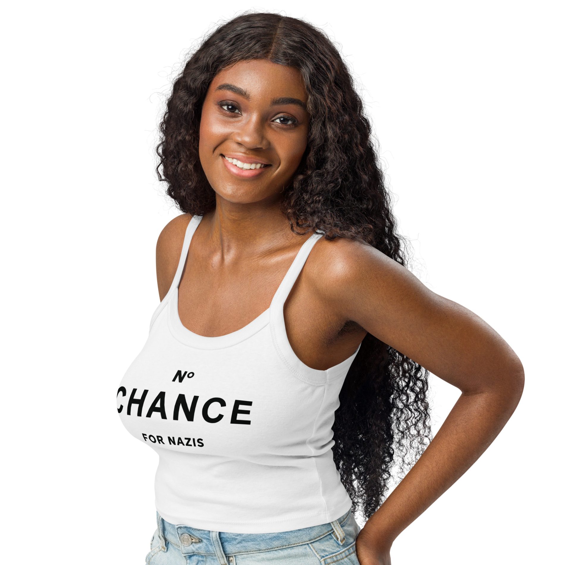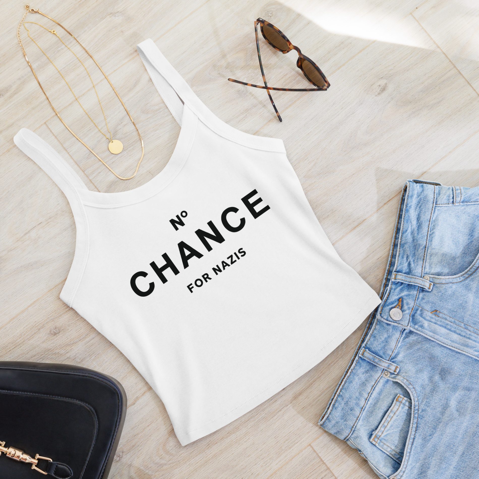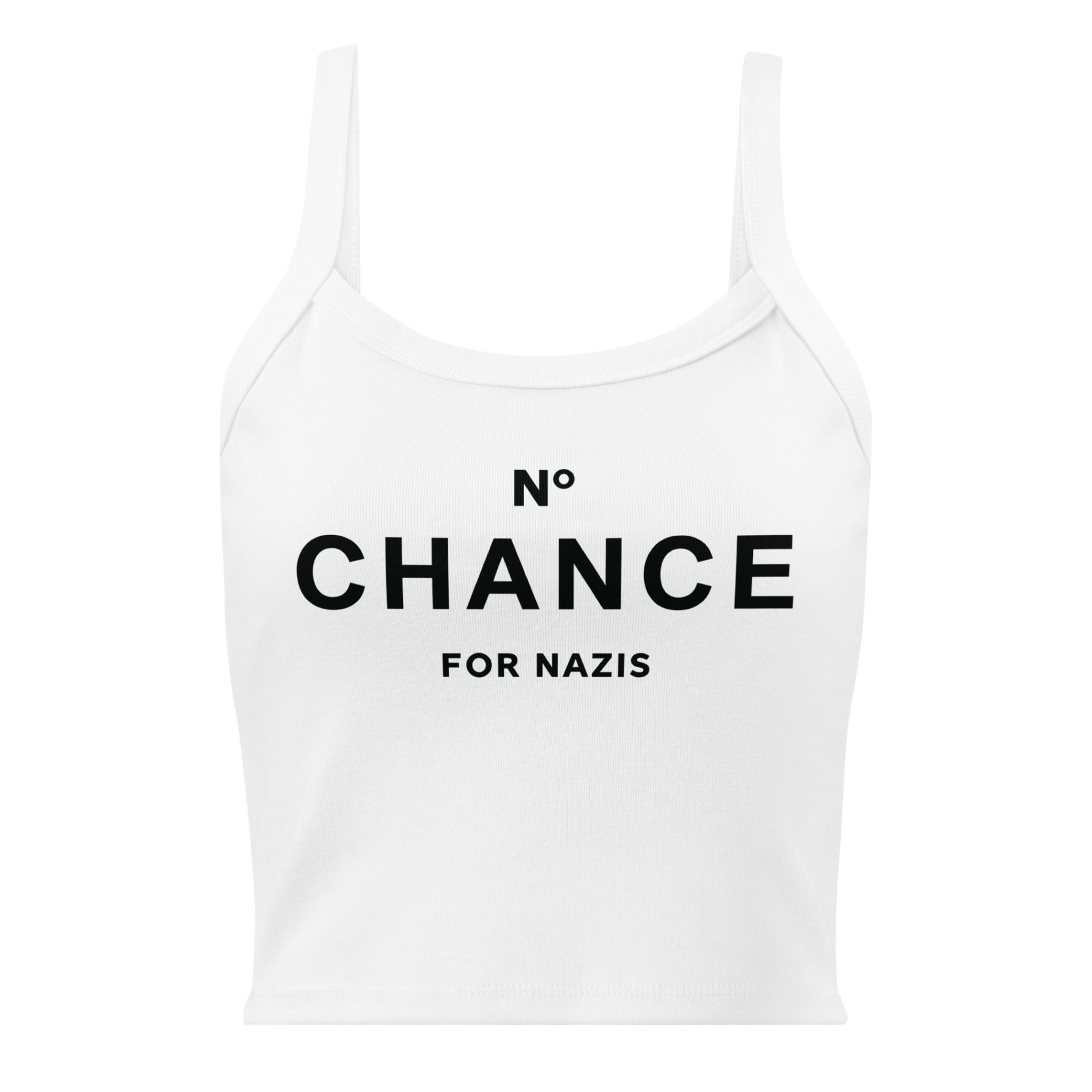 No Chance for Nazis dámské žebrované tílko je ostrý antifašistický statement, který je čitelný na první pohled. Minimalistický micro-rib střih. Motiv je udělaný jako parodie na ikonickou estetiku luxusních parfémů – čistá typografie, “label” vibe, ironie bez zbytečných slov. Motiv tiskneme kvalitním DTF potiskem, takže zůstává ostrý, sytý a dobře čitelný i při pravidelném nošení.