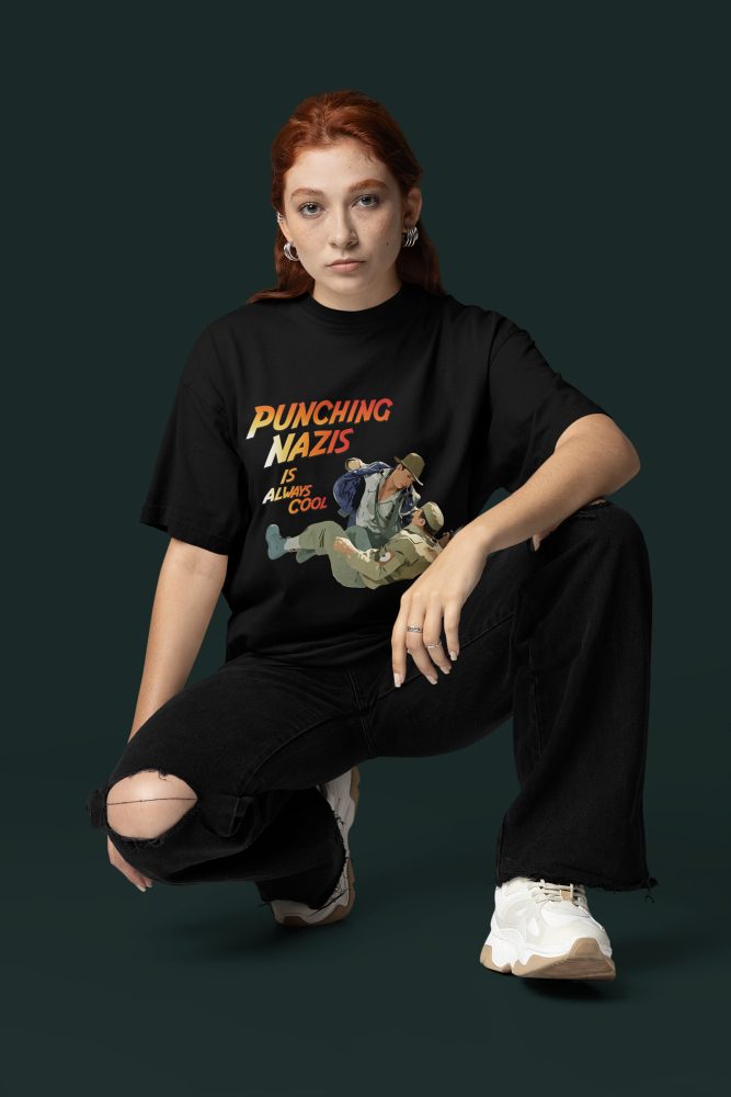 Tričko Punching Nazis Is Always Cool kombinuje antifašistický postoj s odkazem na ikonickou scénu z filmu Indiana Jones, kde pěst přistála přesně tam, kam patřila. Tento design je přímým a zároveň satirickým vyjádřením nesouhlasu s fašismem, nenávistí a krajní pravicí. Ideální pro každého, kdo se nebojí jasného názoru.