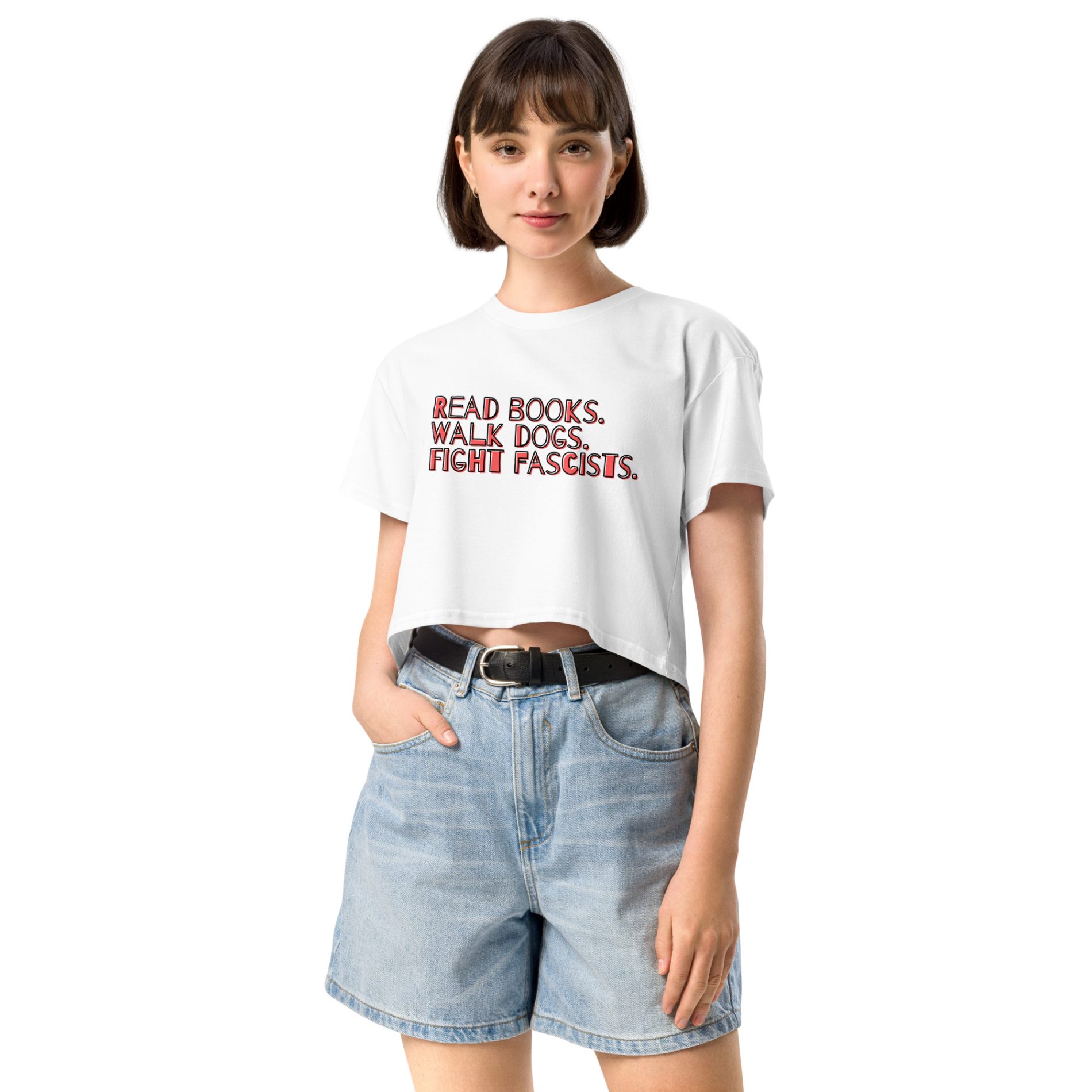 Read books. Walk dogs. Fight fascists. crop top od AS Colour je lehký, pohodlný a ideální pro každého, kdo chce propojit osobní styl s jasným antifašistickým postojem. Moderní střih, díky kvalitnímu bavlněnému materiálu se příjemně nosí celý den.