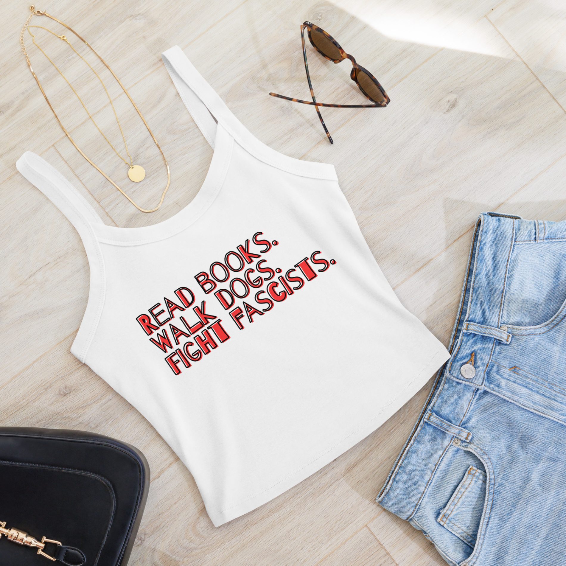Read books. Walk dogs. Fight fascists. dámské žebrované tílko je slogan pro lidi, co mají jasné priority – čtení místo ignorace, péče místo cynismu a odpor proti fašismu místo tichého přihlížení. Motiv tiskneme kvalitním DTF potiskem, takže zůstává ostrý, čitelný a sytý i při pravidelném nošení. Micro-rib žebrovaný materiál.