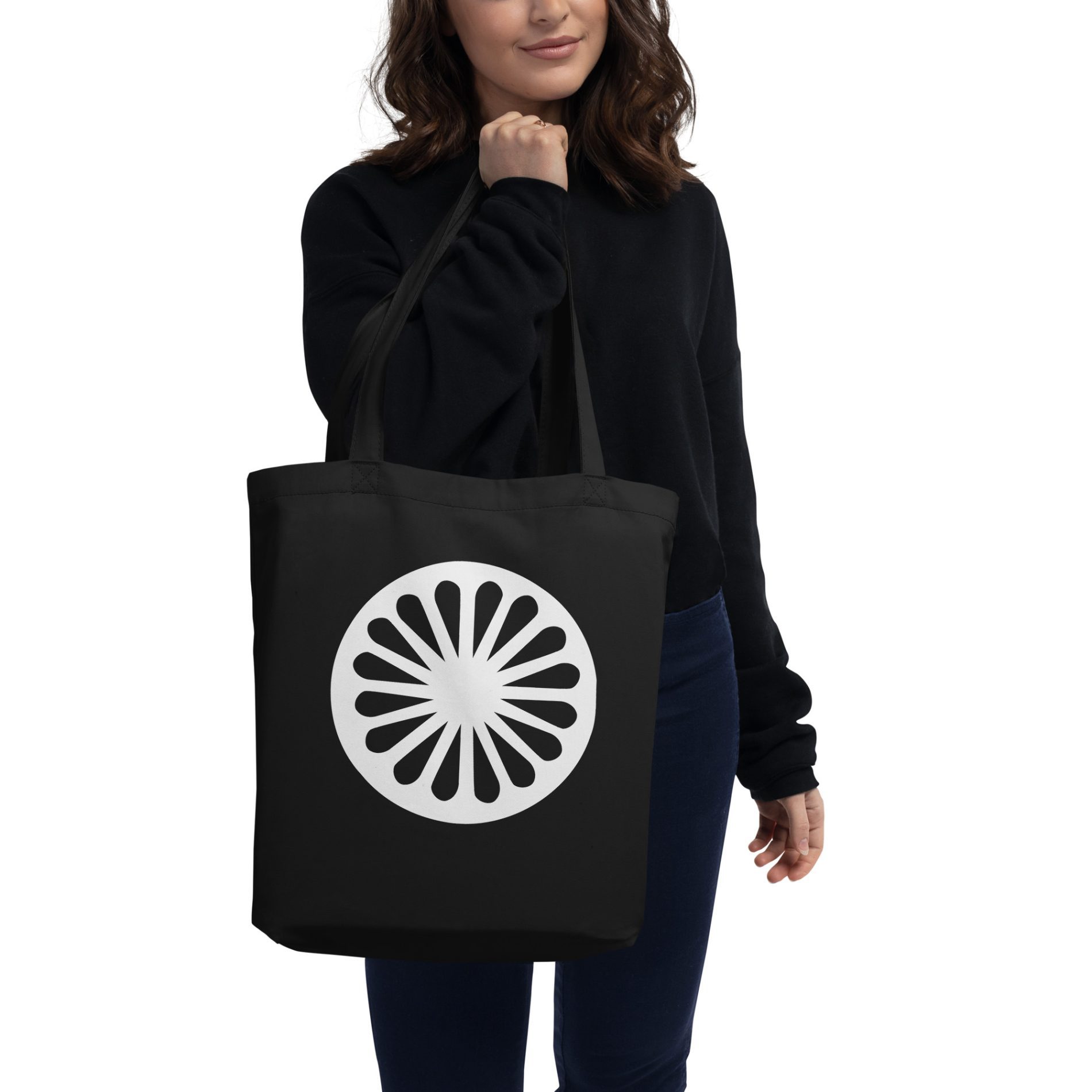 Romské kolo (čakra) organická taška je silným symbolem romské identity, historie a odporu proti rasismu a útlaku. Čakra představuje pohyb, svobodu a vytrvalost romské komunity v boji za rovnoprávnost a důstojnost. Tahle taška jasně vyjadřuje solidaritu s Romy a odmítnutí rasismu v jakékoliv podobě.
