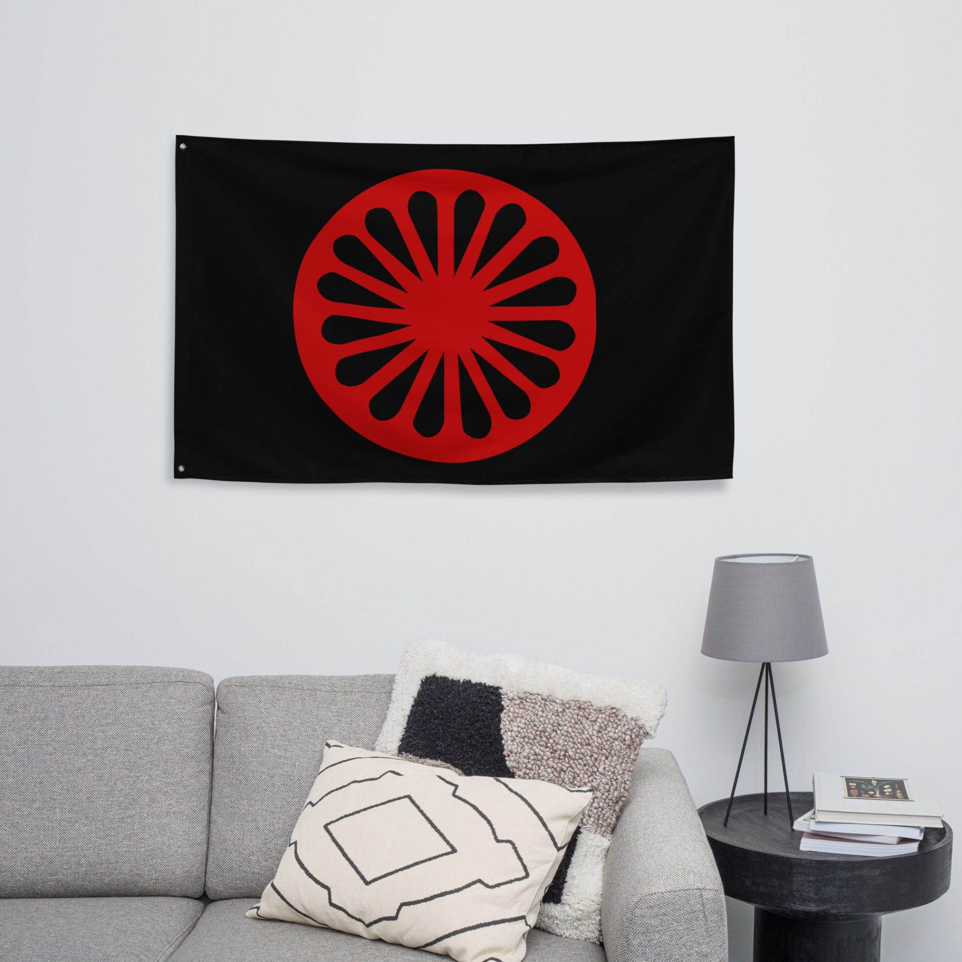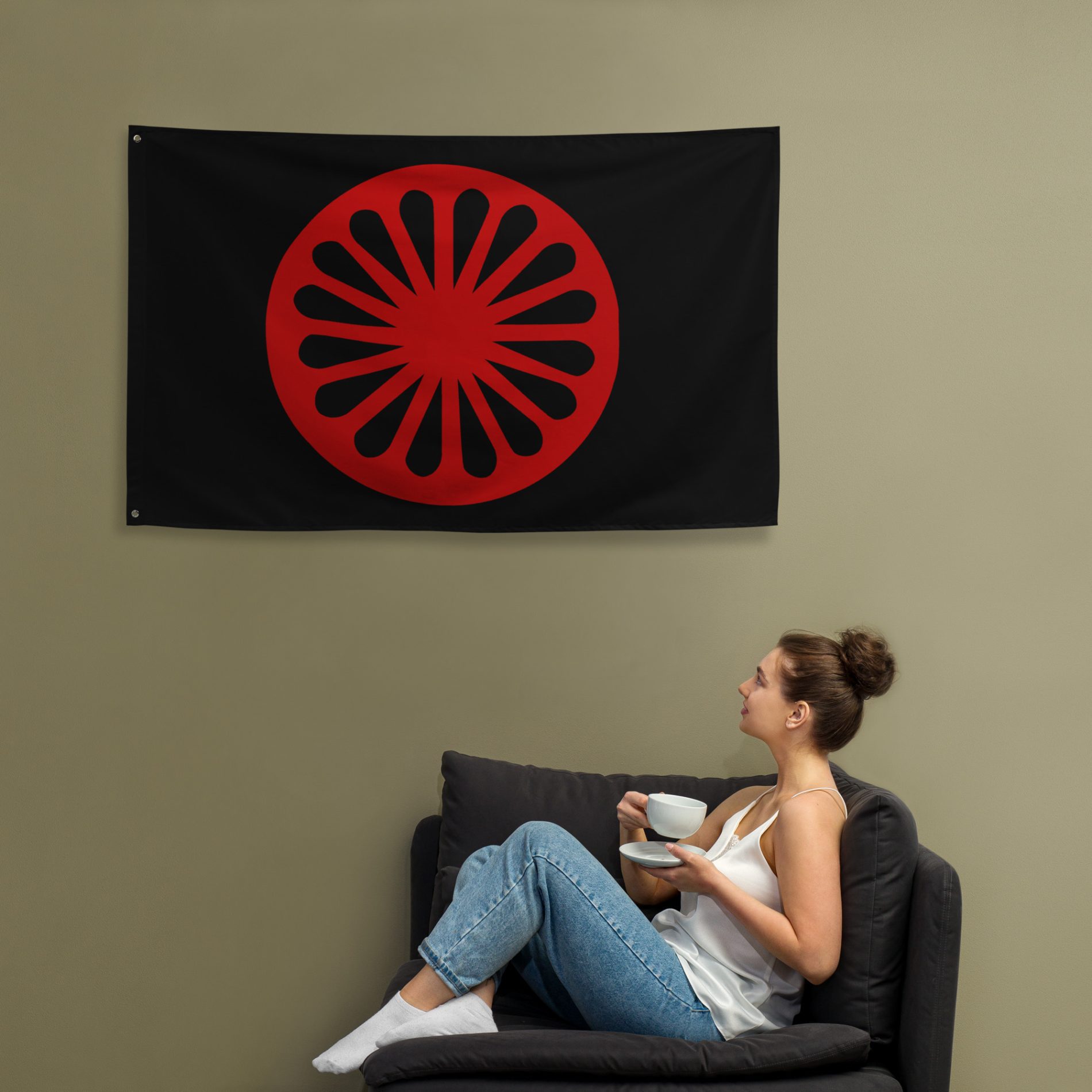 Romské kolo (červená čakra) vlajka je klasická romská vlajka - silný symbol romské identity, hrdosti a odporu proti rasismu. Červené kolo uprostřed odkazuje na cestu, pohyb a přežití navzdory útlaku. Je to vlajka, která říká nahlas: jsme tady, patříme sem a nenecháme se umlčet.